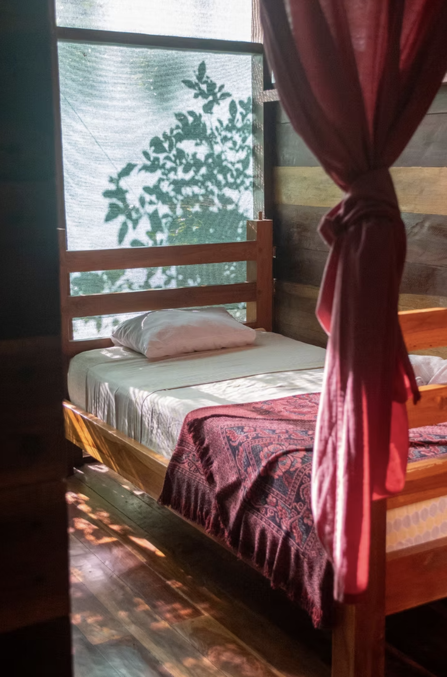 Comfortable and communal, Casa Verde is a large, open-air dormitory near the café, yoga studios, cabinas, and outdoor bathrooms. Double-screened walls and ceiling fans invite natural breezes, providing simplicity and ease. The space is efficiently designed with seven semi-private sleeping areas, separated by teakwood half-walls. Each space includes a single bed, side table, reading lamp, linens, and towels—ideal for guests seeking connection and shared experience.