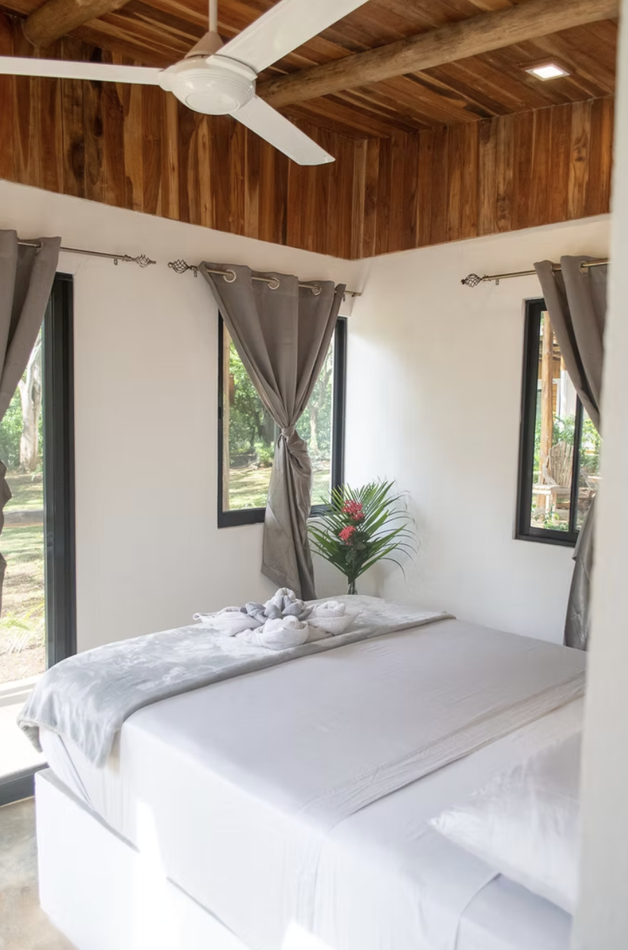 All offer an ensuite bathroom, closet, sitting area, air conditioning, indoor and outdoor ceiling fans, natural and ambient lighting, and deck furniture—designed for restful simplicity and ease.